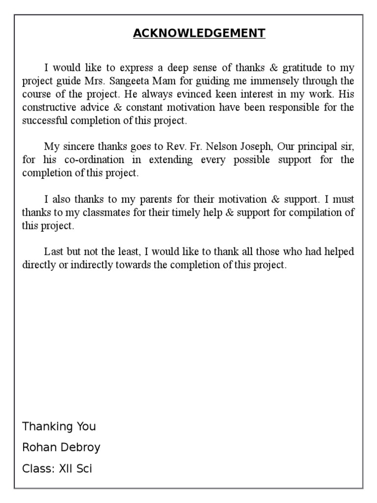 Below are several samples of acknowledgment letters which you may find useful: I am are over helmed in all humbleness and gratefulness to acknowledge my depth to all those who have helped me to put these ideas, well above the level of simplicity and into something concrete. Let's have a detailed view regarding this. A page of acknowledgements is usually acknowledgements enable you to thank all those who have helped in carrying out the research. The main purpose of having an acknowledgement page is offering a thankful note to those who provided support to you during the study. I would like to express my gratitude to my primary. Acknowledgement letter can be writing for several reasons including for receiving documents, for project, for payment, for thesis or some other things. I take this opportunity to express my profound gratitude and deep regards to my teachers prof. Sample for an english project acknowledgement. Acknowledgment samples (for icse, ib, cbse and college projects). Writing a best acknowledgement section is an important part of your project report. Without thanking my parents for their unwavering support this acknowledgement would be incomplete. If you are looking for acknowledgement sample for college project report you have come to the right place.